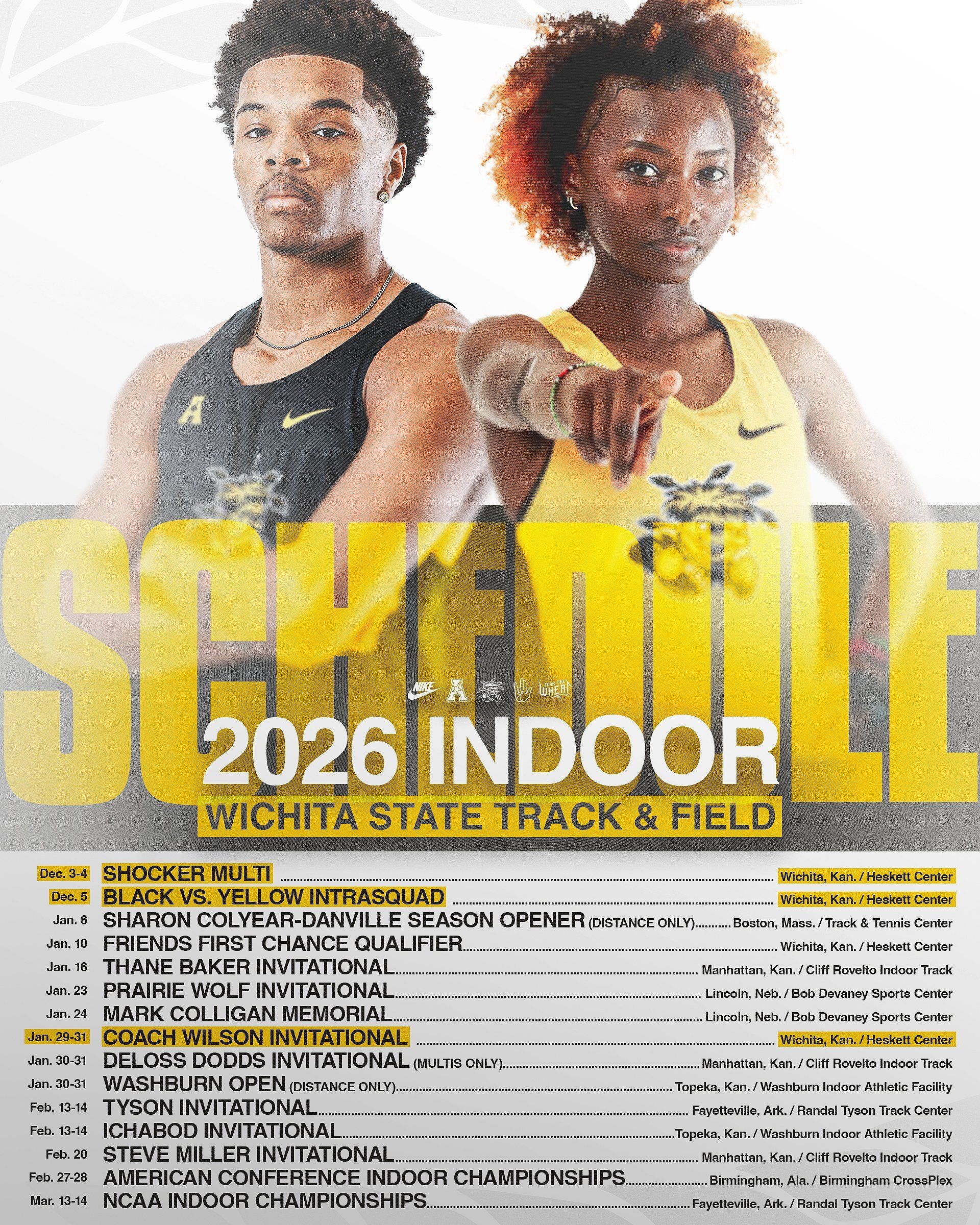 🔼 Mark the Calendar! The track and field indoor schedule is here! The Shockers will have three home meets (highlighted in yellow).